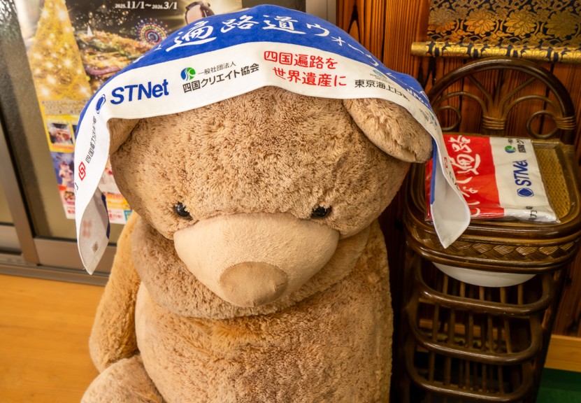 毎回お接待いただいています。飲み物やお菓子などでお接待して下さいました。いつも歴代のタオルマフラーを飾って参加者を迎えてくれます。普段からおもてなしステーションとして、お遍路さんにお接待されています。