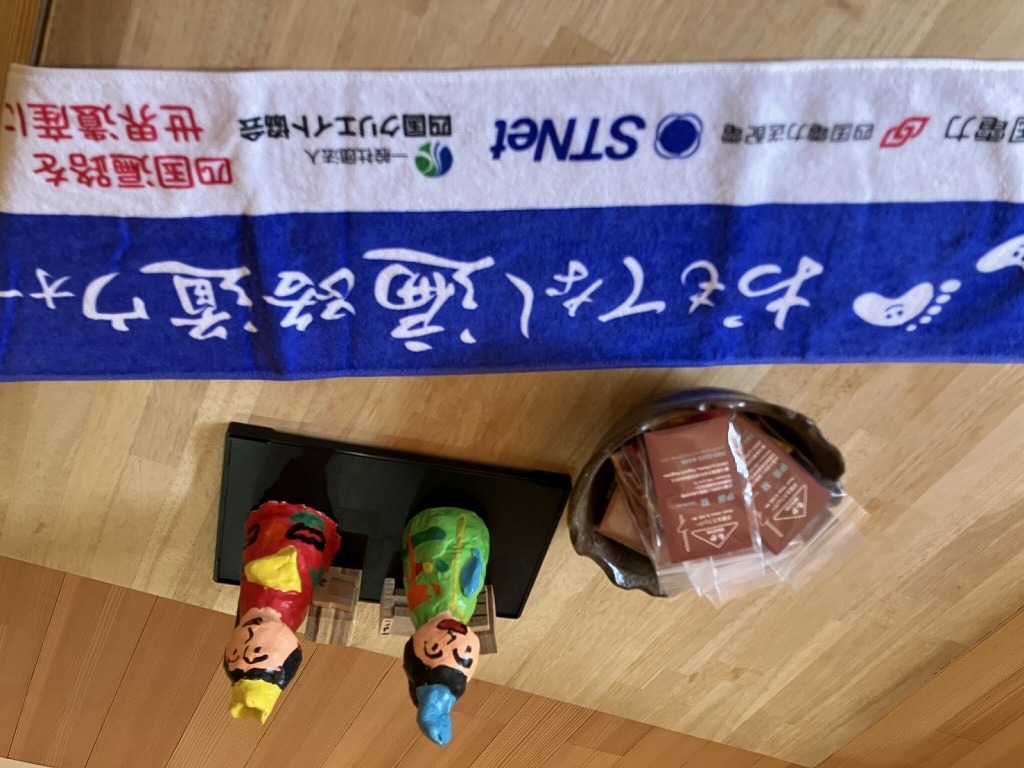 手作りの四万十新聞バック、飴、己書のハガキに書いた作品でお接待してくださいました。
