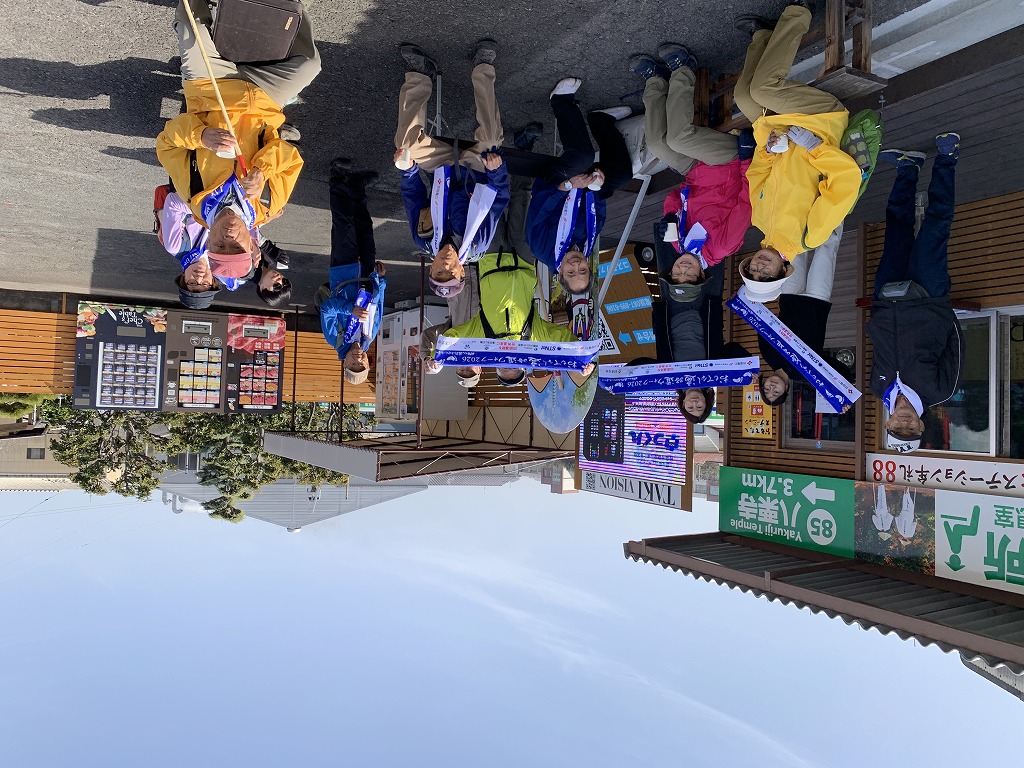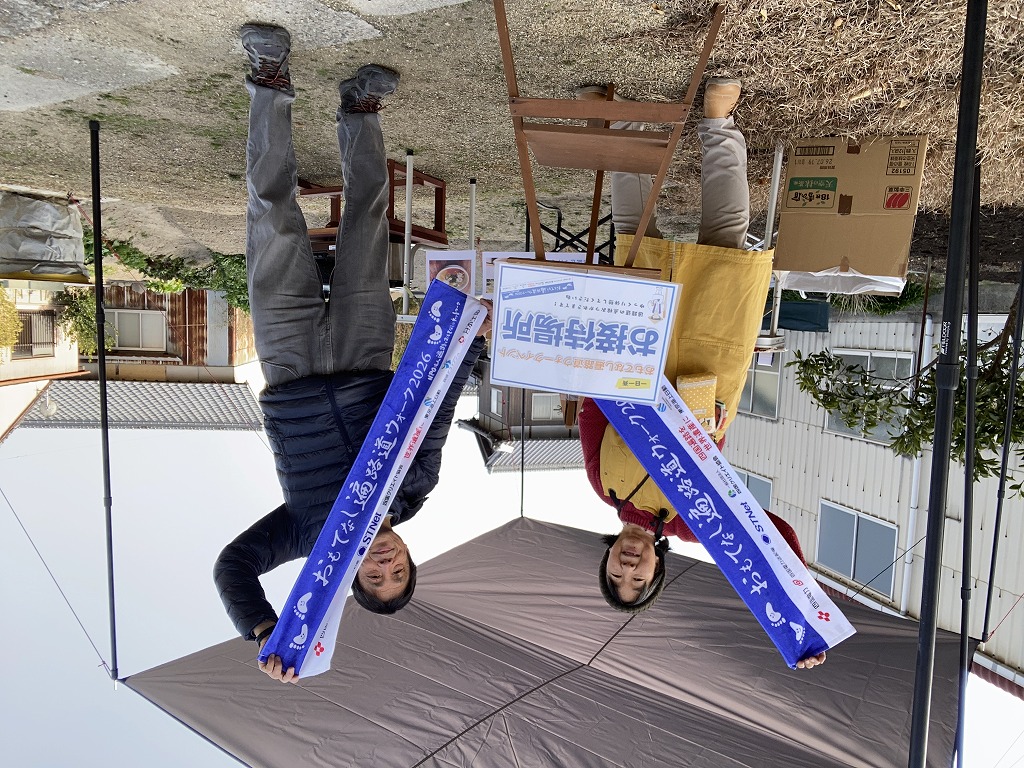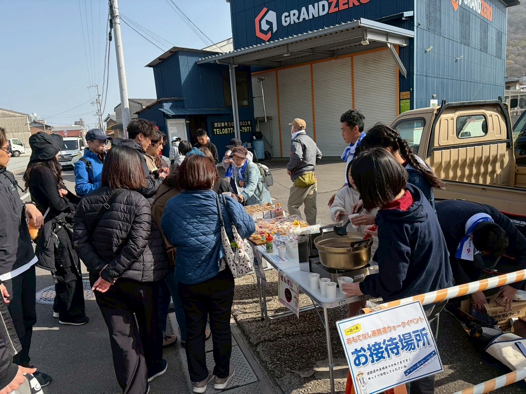 お好み焼きバンビさんの敷地で、ココア・スープなどの温かい飲み物、スポーツドリンク・ジュースなどの冷たい飲み物、お菓子などをお接待いただきました。取材もありがとうございました。