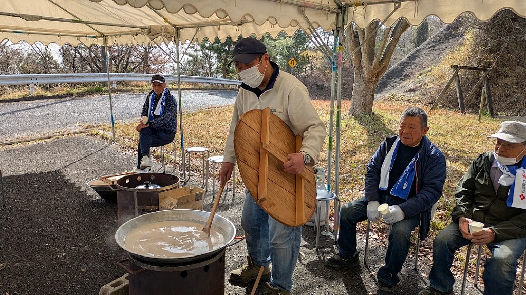 第10回に引き続きのご参加。鬼無小学校100周年記念植物園駐車場で甘酒をお接待して下さいました。山中での大鍋の準備等大変だったことと思います。ありがとうございます。