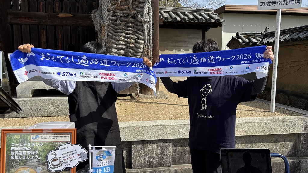 第10回に引き続きのご参加。70番札所 本山寺にて、薬師寺寛邦キッサコさんの般若心経MVをBGMに、蠣三珈琲「おへんろ珈琲」とコーヒーに合うカラメルビスケットを蠣三珈琲の社員さんと一緒にお接待をして下さいました。蠣三珈琲では「四国遍路」をイメージしたドリップバッグコーヒー4種類発売中です。
